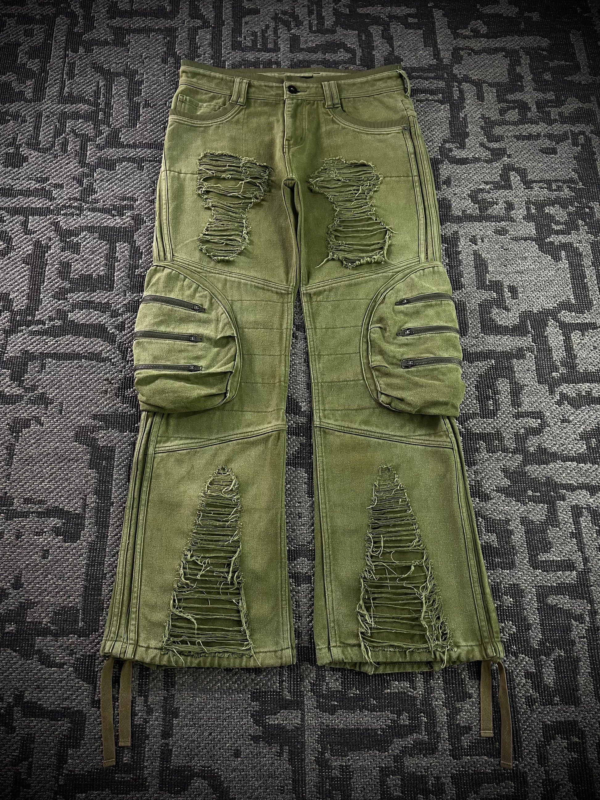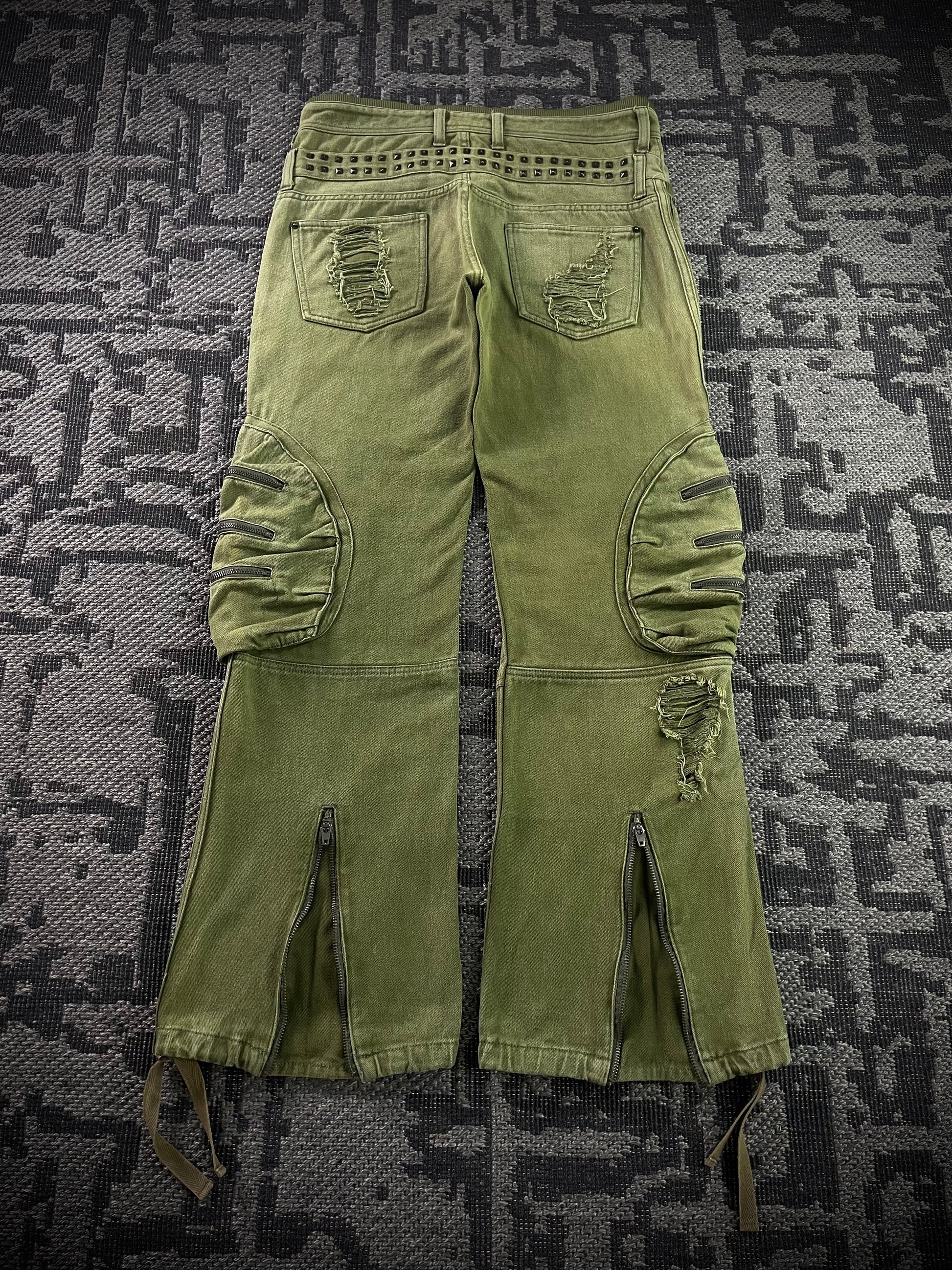 Glad News olive wide-leg cargo pants with distressed finish. Triple-zip cargo pockets at the knees, aged brass studs below the back waistband, and adjustable hems with drawstrings and zippers. True to the brand’s raw, punk-apocalyptic aesthetic.