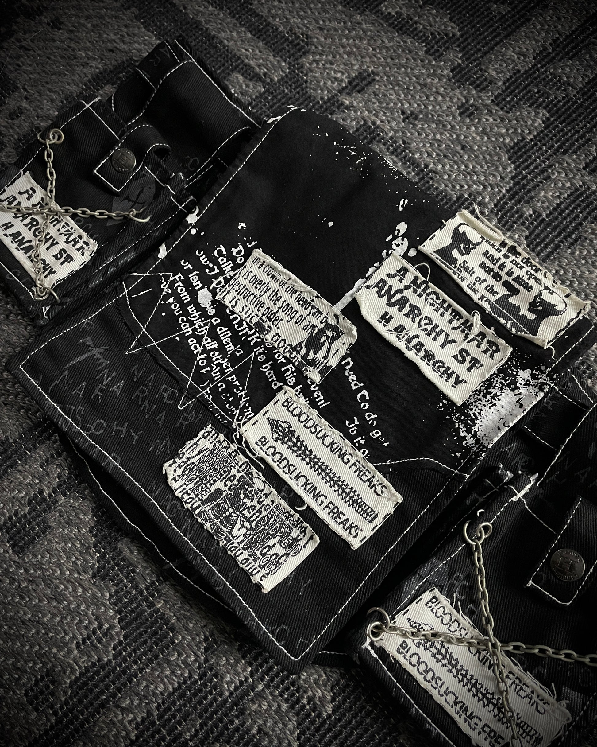 Founded in 1997, H.Naoto is a pioneering Japanese fashion brand known for its dark, avant-garde designs that fuse gothic, punk, and visual kei aesthetics. The “H.Anarchyism for PLUS” belt bag continues this legacy, crafted from black canvas and layered with multiple patches and prints. Featuring chains and mixed-font lettering, it also showcases printed details on both the interior and back, giving it a unique, rarely seen character. The bag has one main compartment and two smaller pockets, with an adjustable strap fitting waists up to 33 inches.