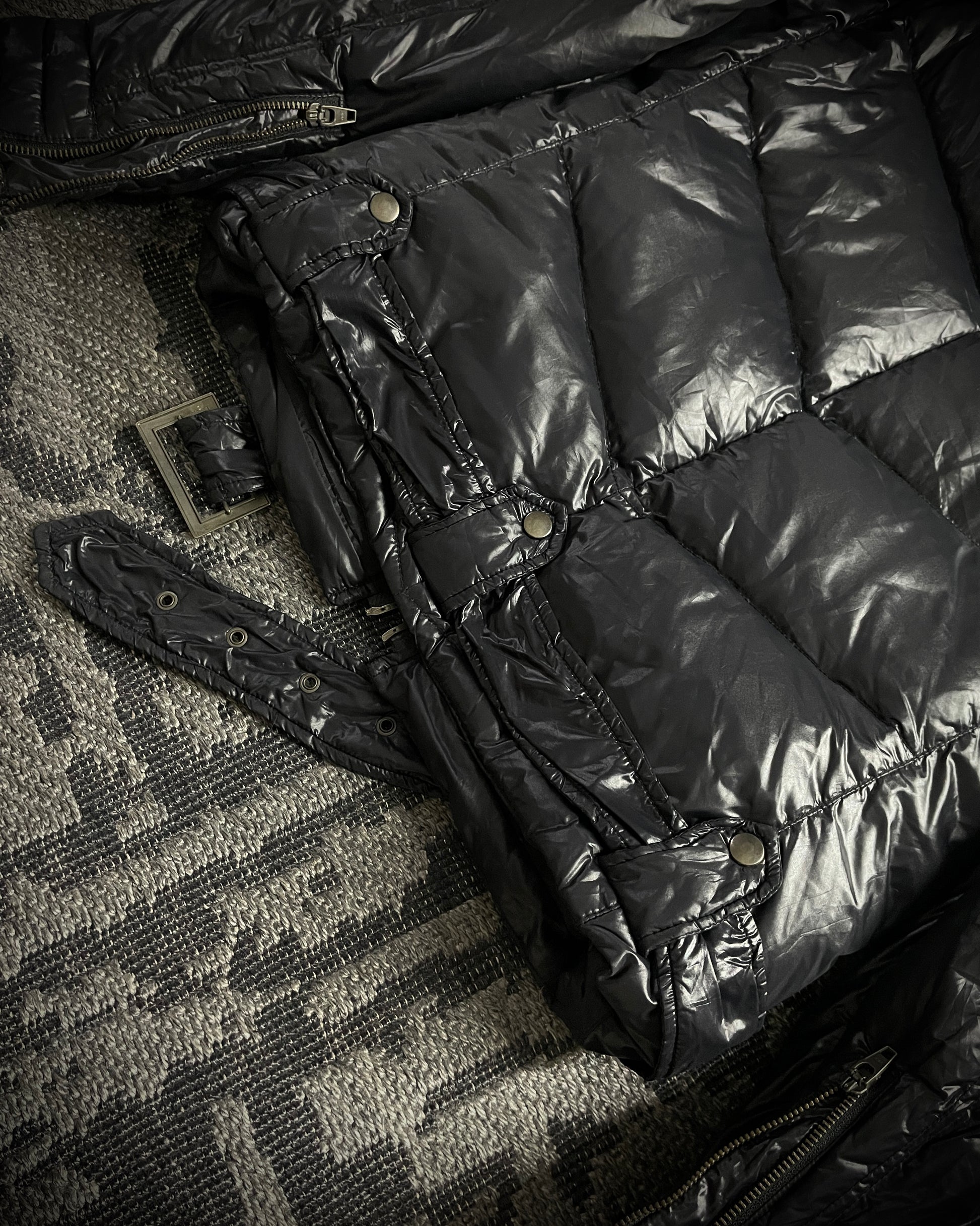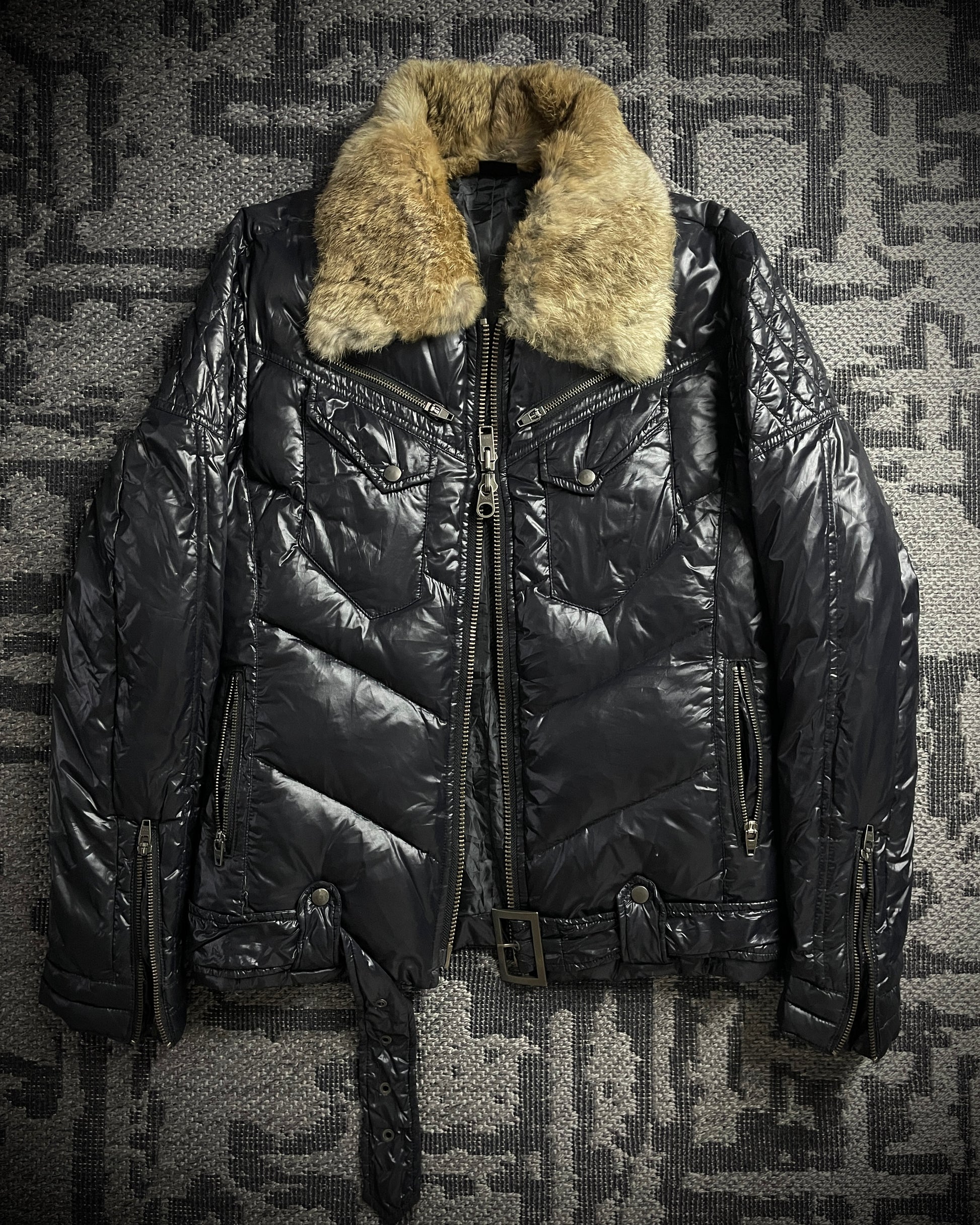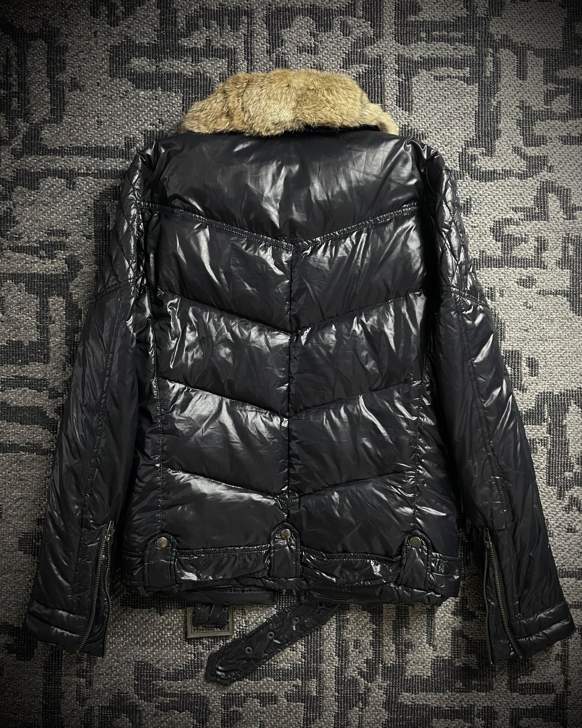 A puffer jacket from Jackrose, featuring a rabbit fur collar.Nylon outer, filled with down, with a waist belt made from the jacket fabric, zipped cuffs, and multiple chest zippers. Each detail enhances the jacket’s distinctive moto inspired character.