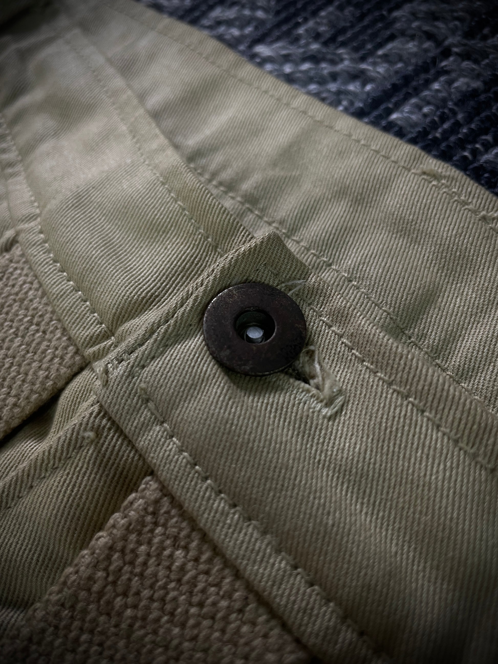 Kam Vercetti, a Japanese underground brand known for experimental, deconstructed designs, blends avant-garde fashion with an urban edge. These cream trousers feature full-leg ruching, adjustable thigh straps, cargo pockets, flared hems, and a small Riri-zippered pocket. Inseam ~35.5.