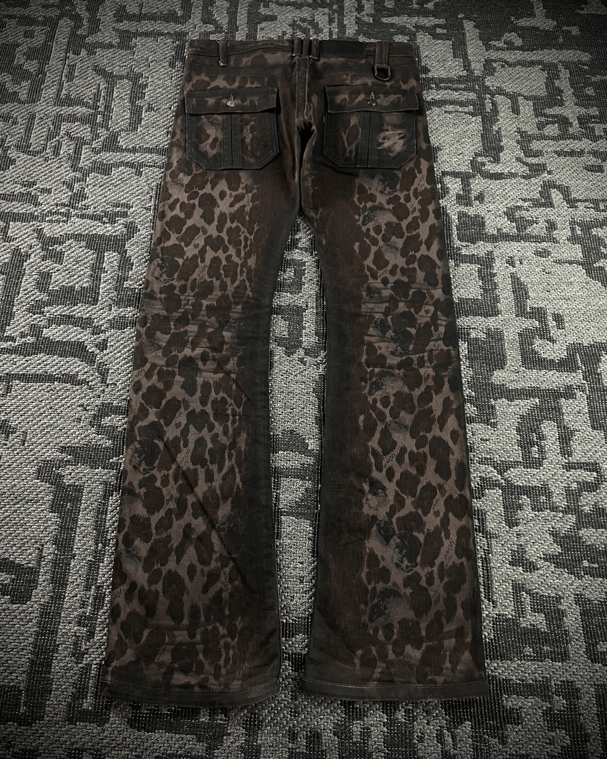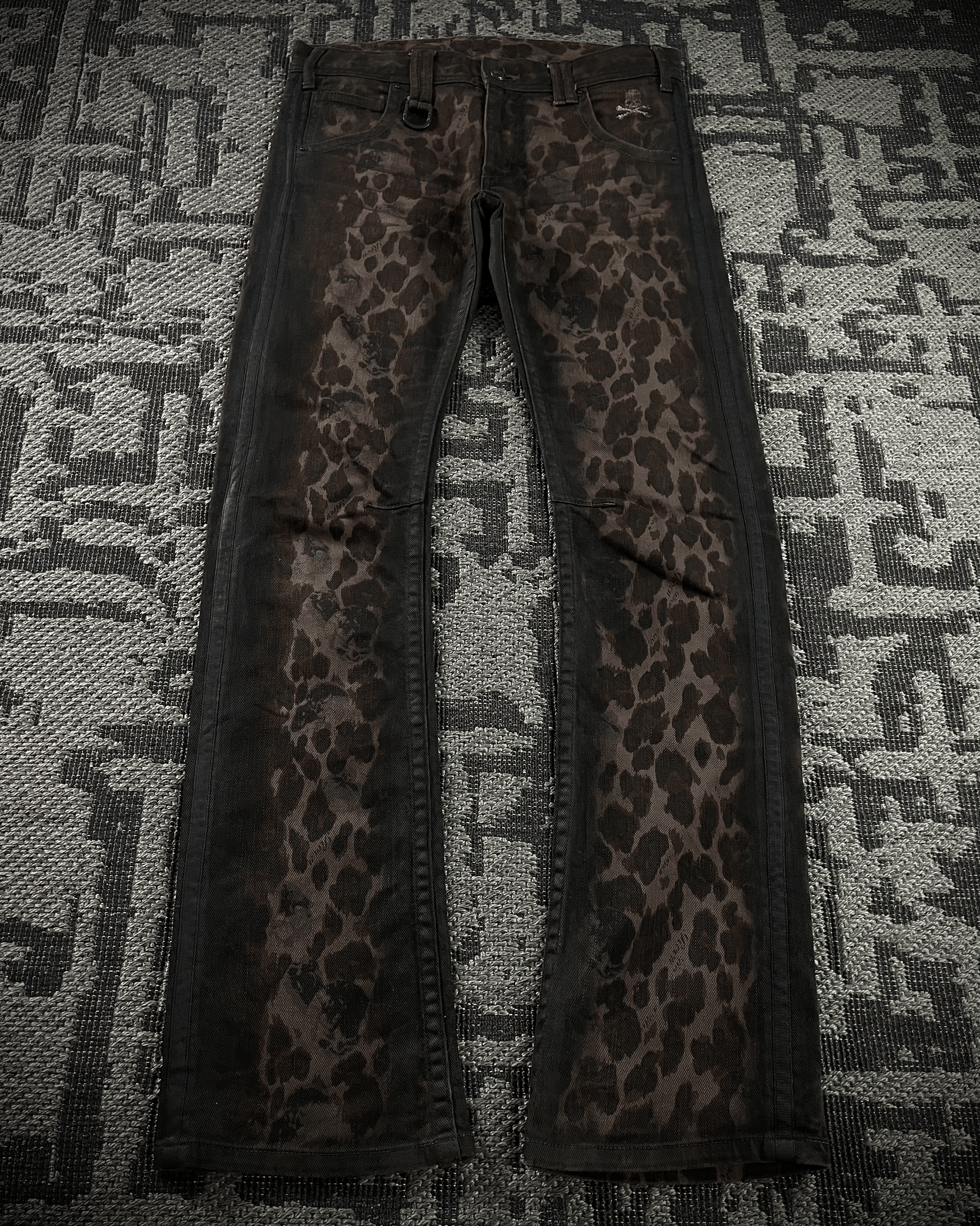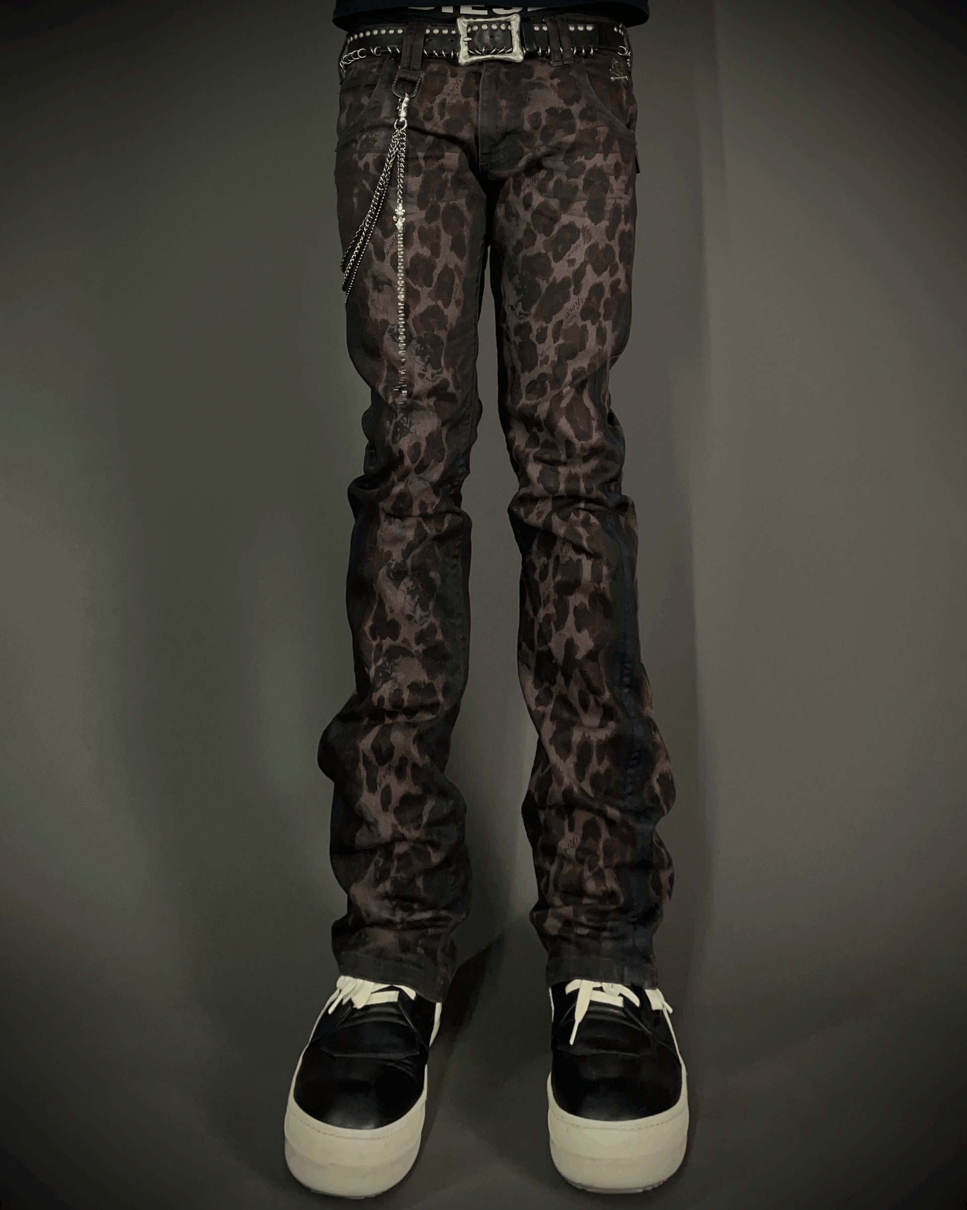 These are Roen jeans with a leopard print, detailed with waxed finishes across multiple areas. Featuring the brand’s signature skull buttons and an embroidered skull on the pocket, with a blackened metal hook for attaching a chain. Designed with a slightly curved leg and a subtle flare at the hem, giving them a distinctive silhouette that feels both alluring and unique.