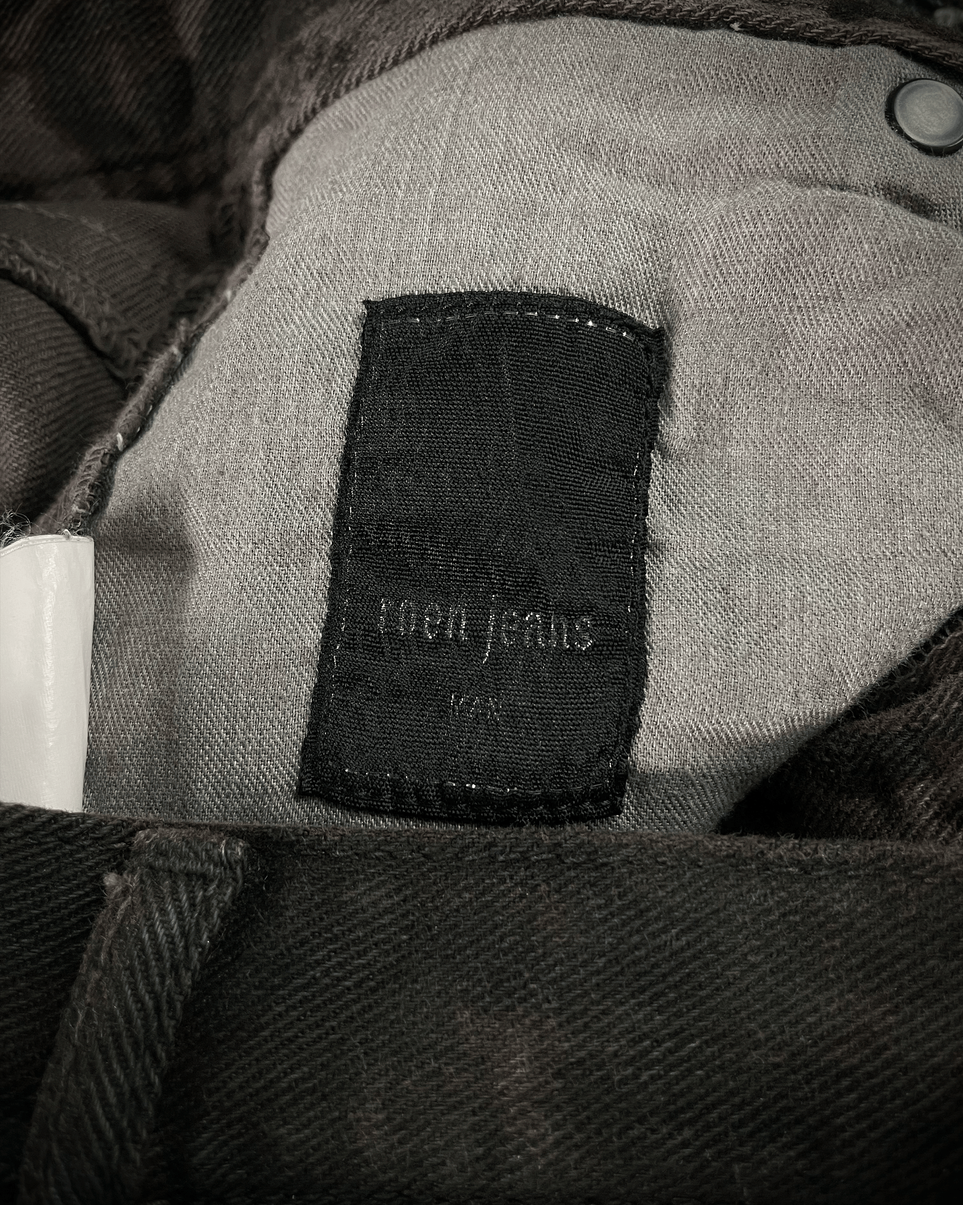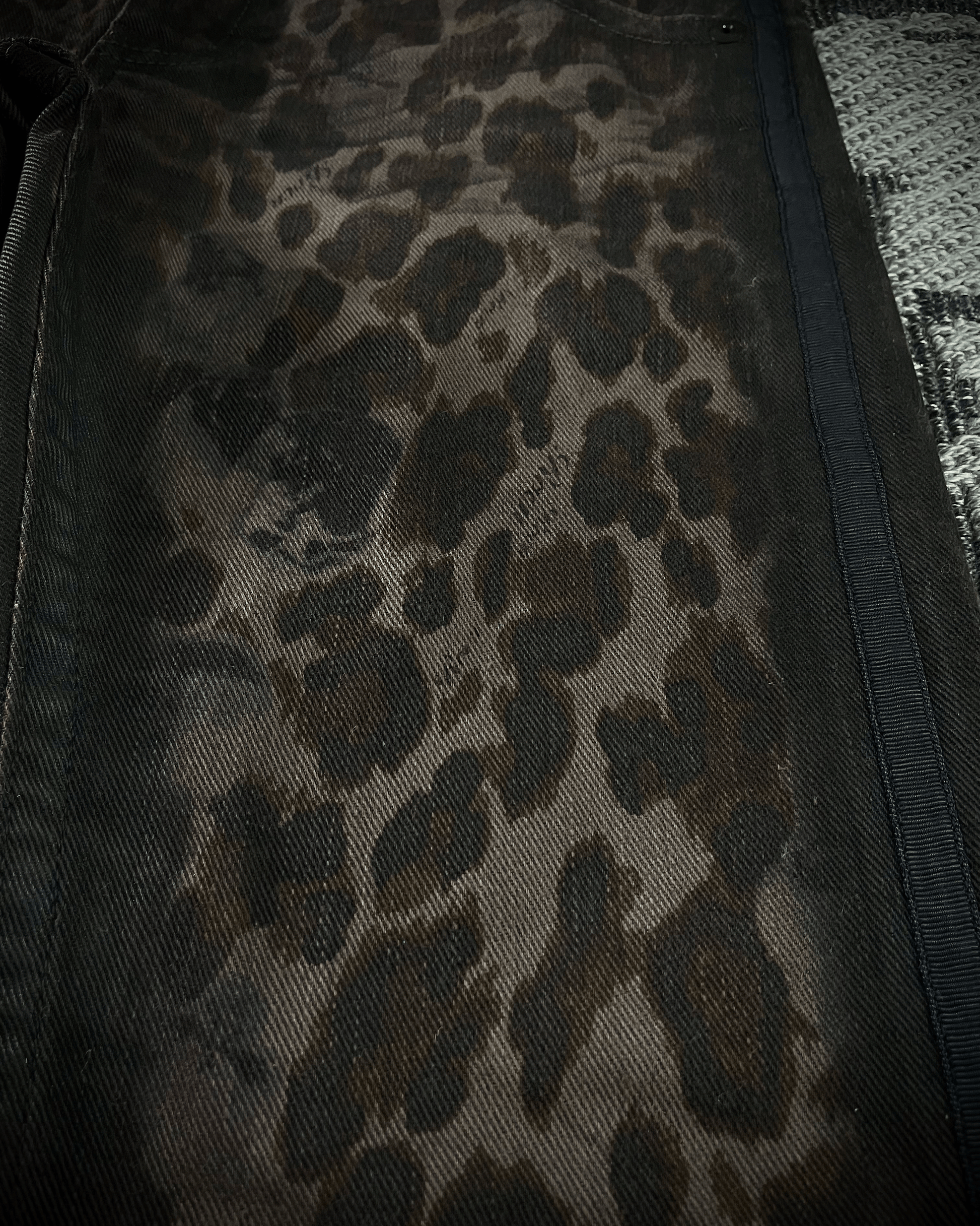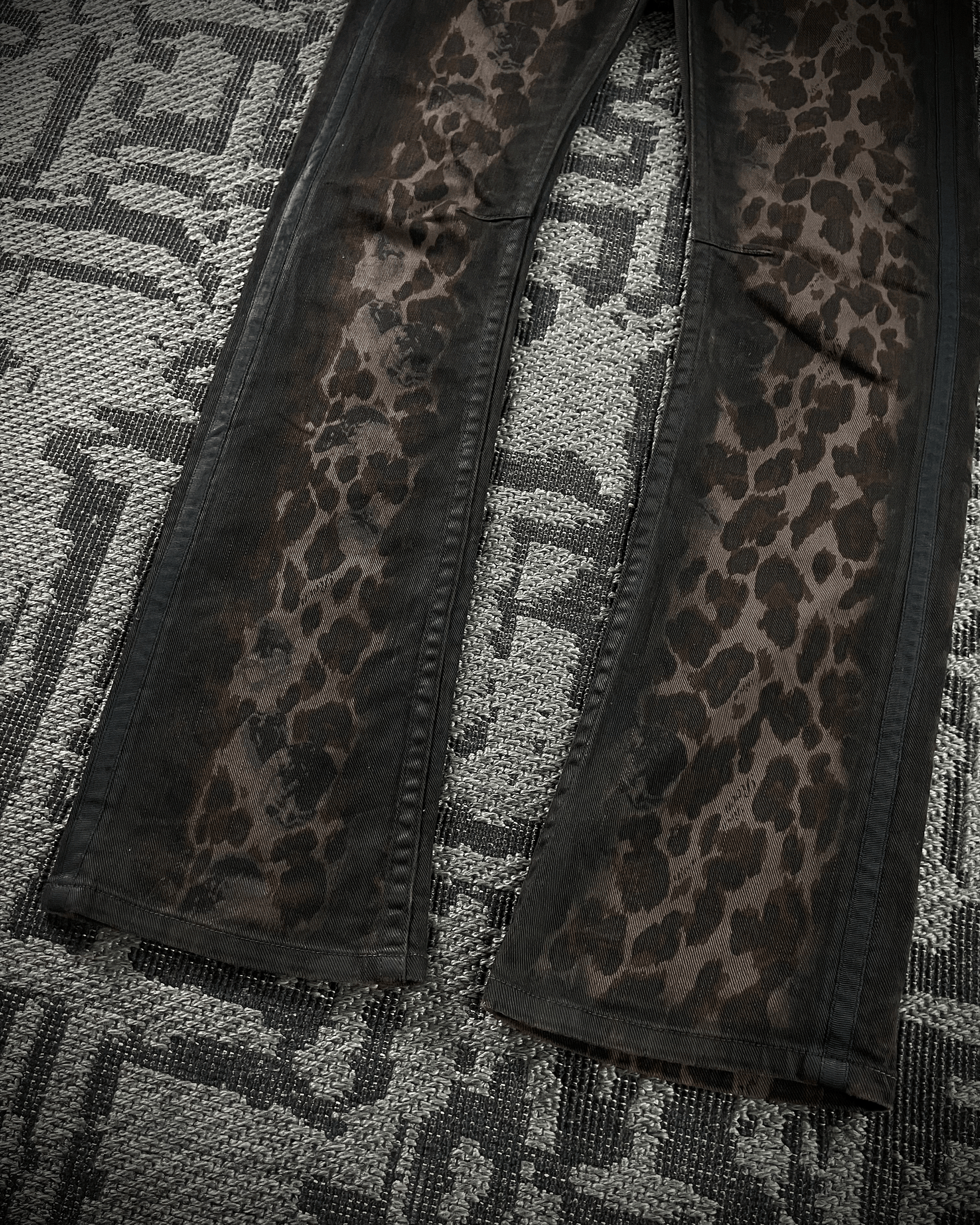 These are Roen jeans with a leopard print, detailed with waxed finishes across multiple areas. Featuring the brand’s signature skull buttons and an embroidered skull on the pocket, with a blackened metal hook for attaching a chain. Designed with a slightly curved leg and a subtle flare at the hem, giving them a distinctive silhouette that feels both alluring and unique.