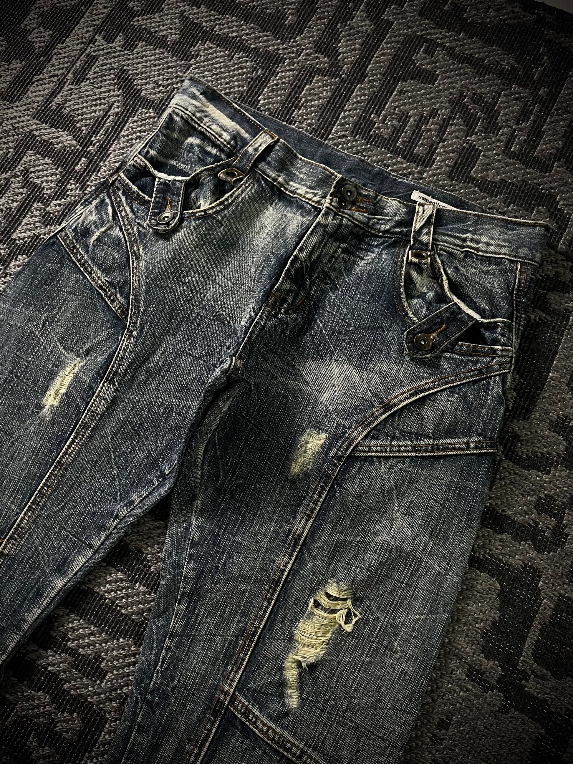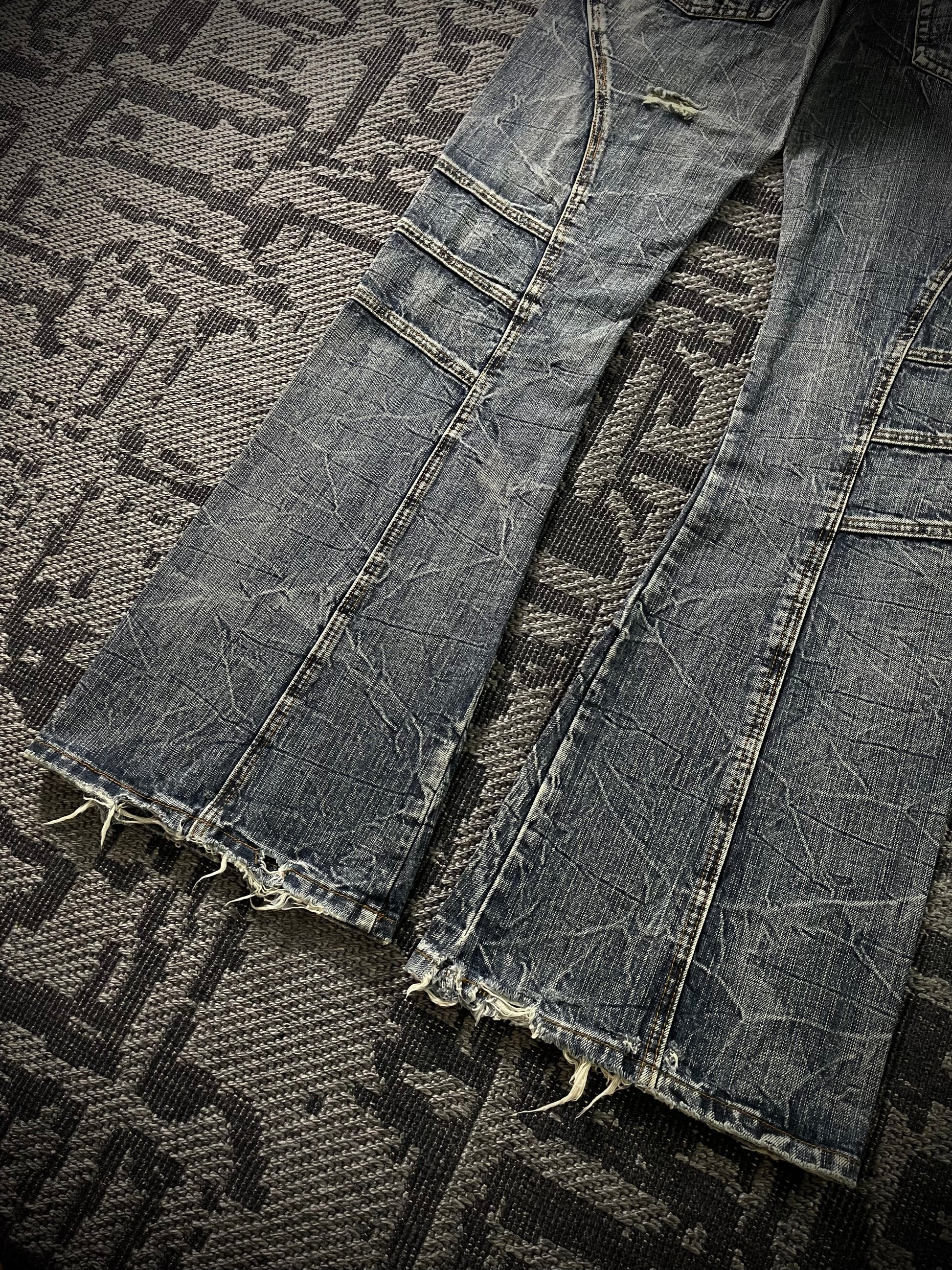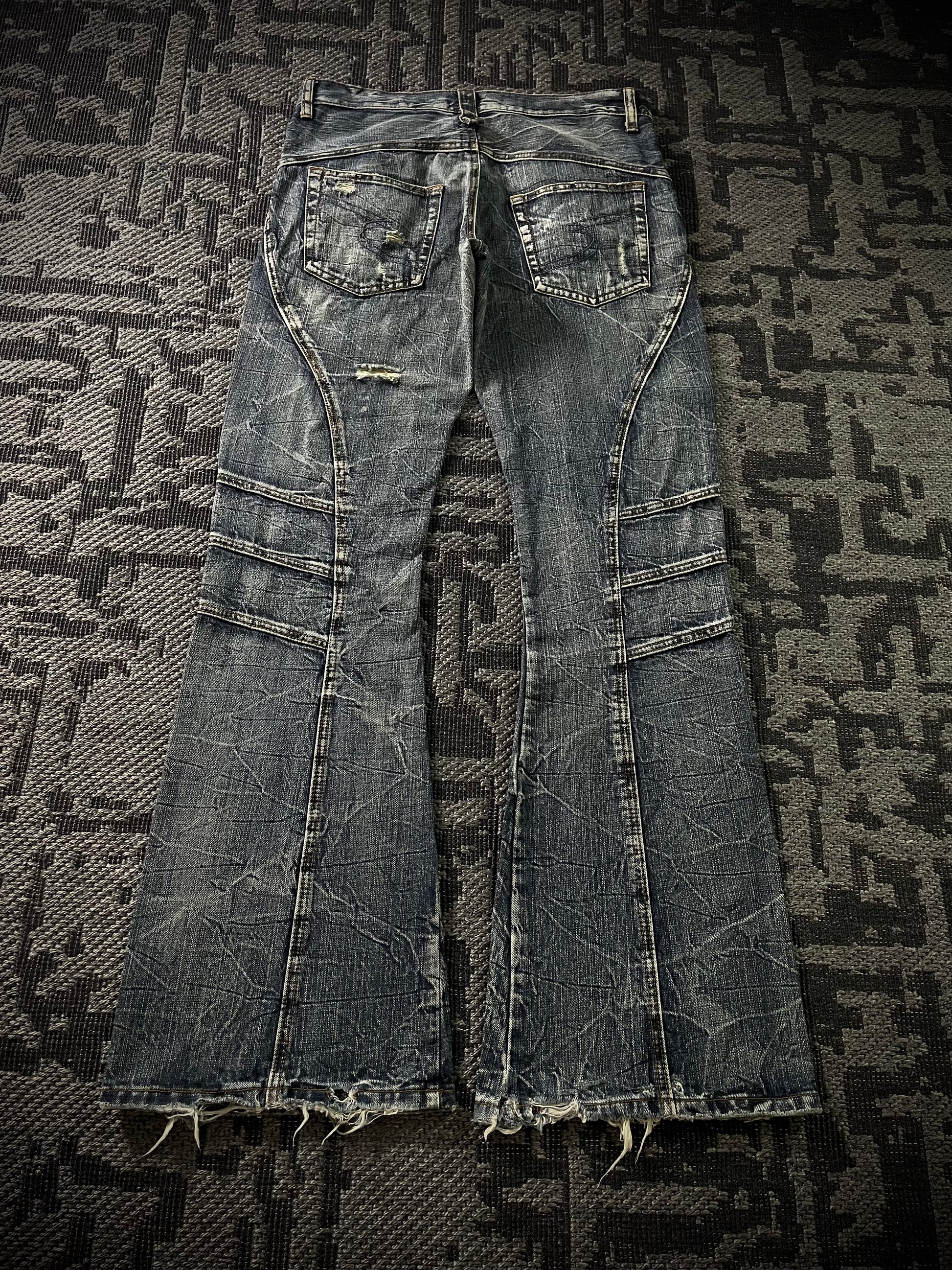 Semantic Design Multi Panel Crinkle Washed Distressed Flared Jeans