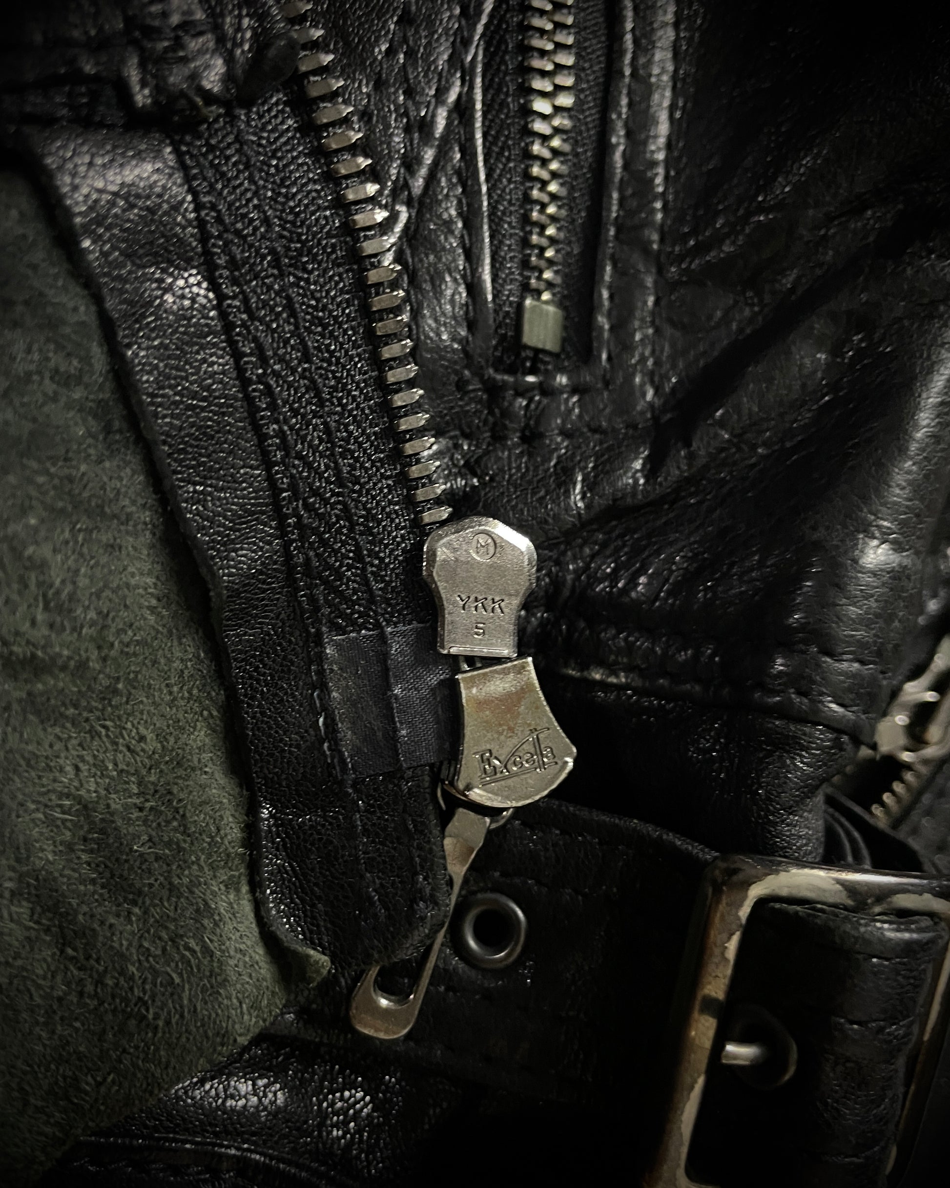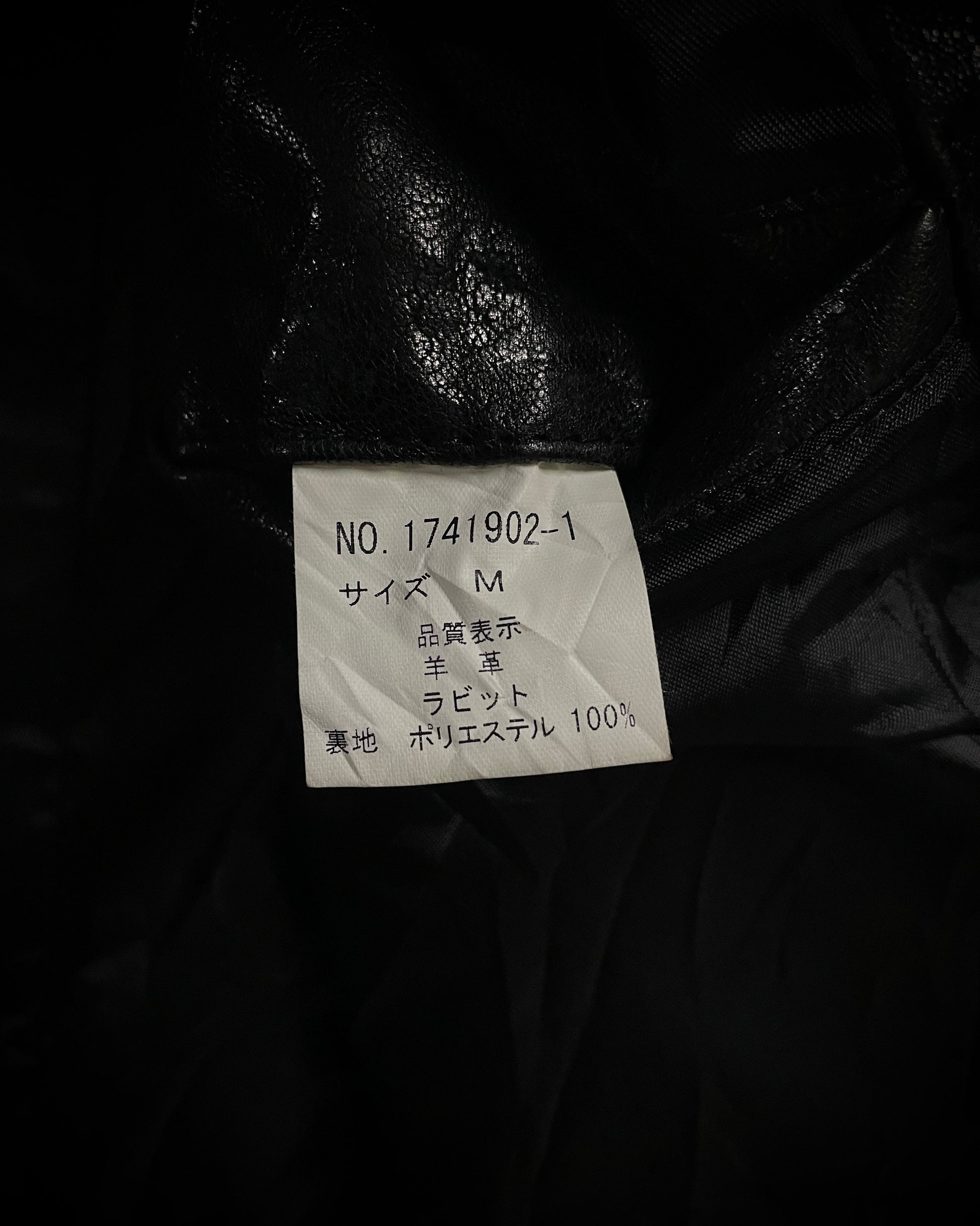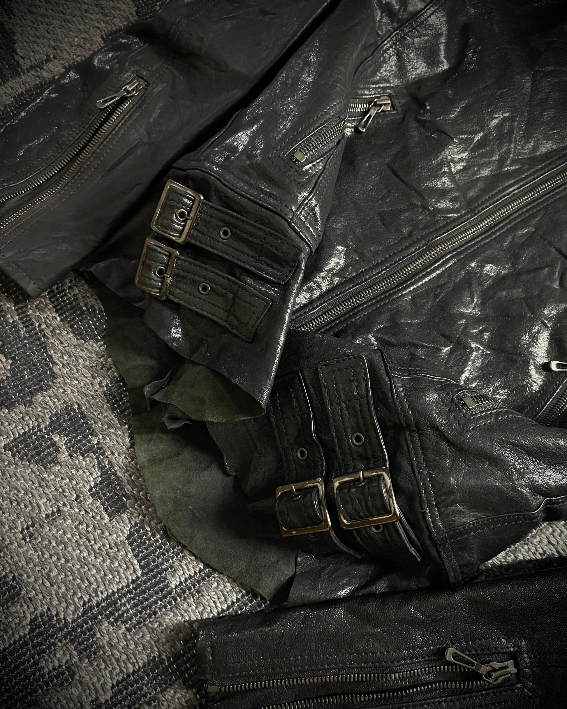 Tete Homme shearling leather jacket featuring rabbit fur accents and a mix of Excella & YKK zippers. Designed with an asymmetrical curved hem and dual buckle straps on each side. The leather displays natural creasing and subtly matte areas in select regions, adding depth and a distinctive textured character.