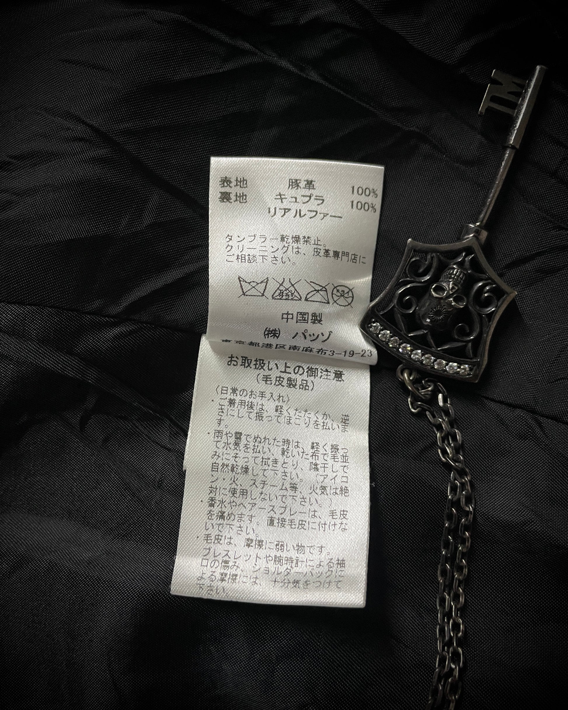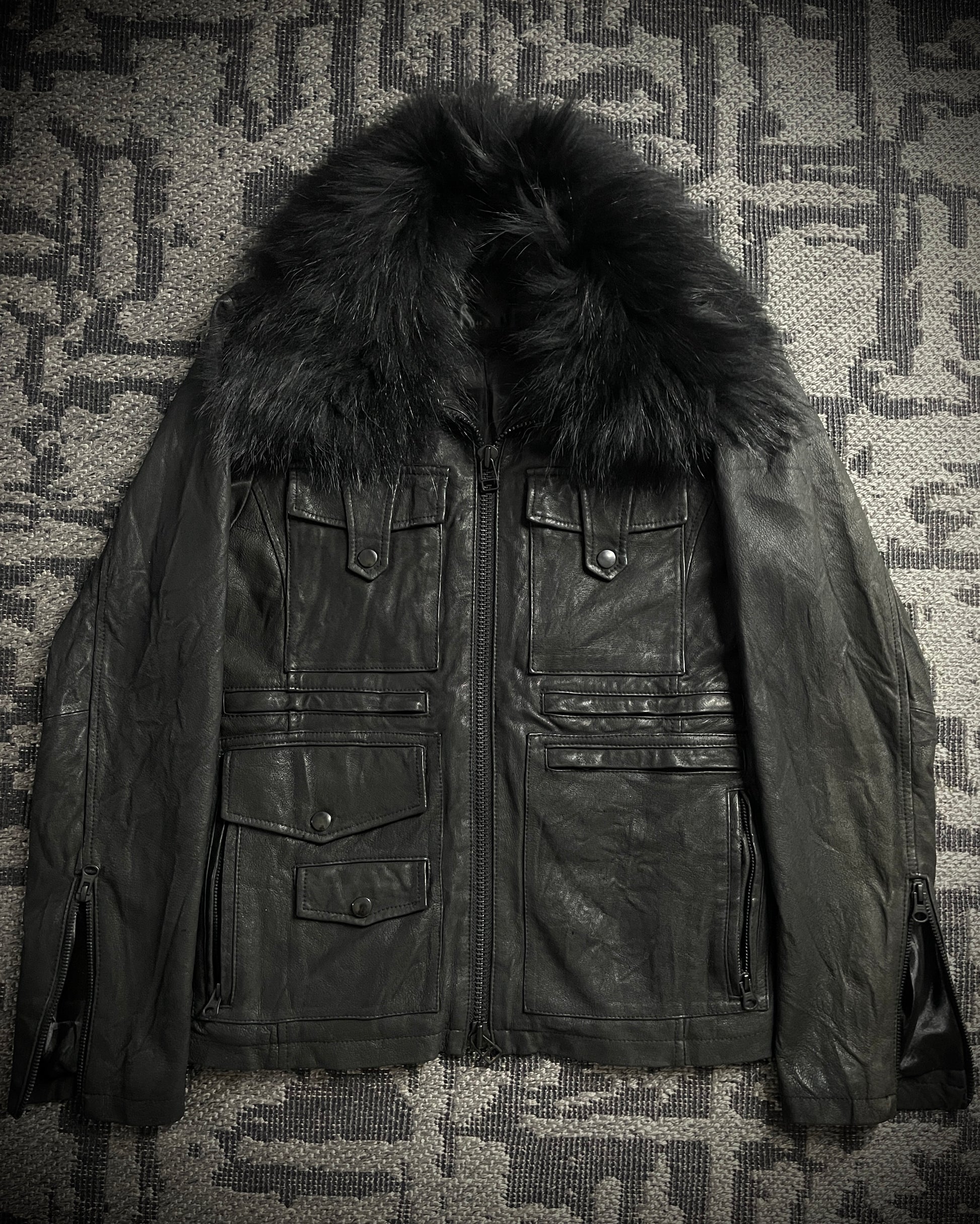 This is a Custom Culture jacket crafted from soft pig leather with natural creases and subtle fading, adorned with long, soft black real fur. The jacket features asymmetrical pockets of varying sizes with black-coated zippers, blending leather and fur to create a raw, grounded piece with distinctive and striking details.